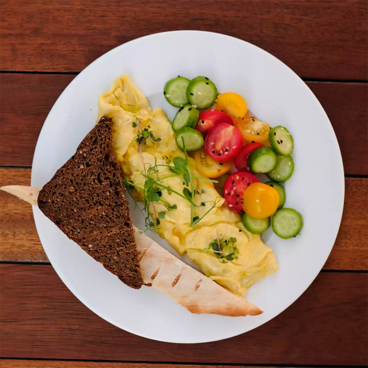 ომლეტი, კიტრი, პომიდორი, გახუხული შოთი, ზეითუნი
