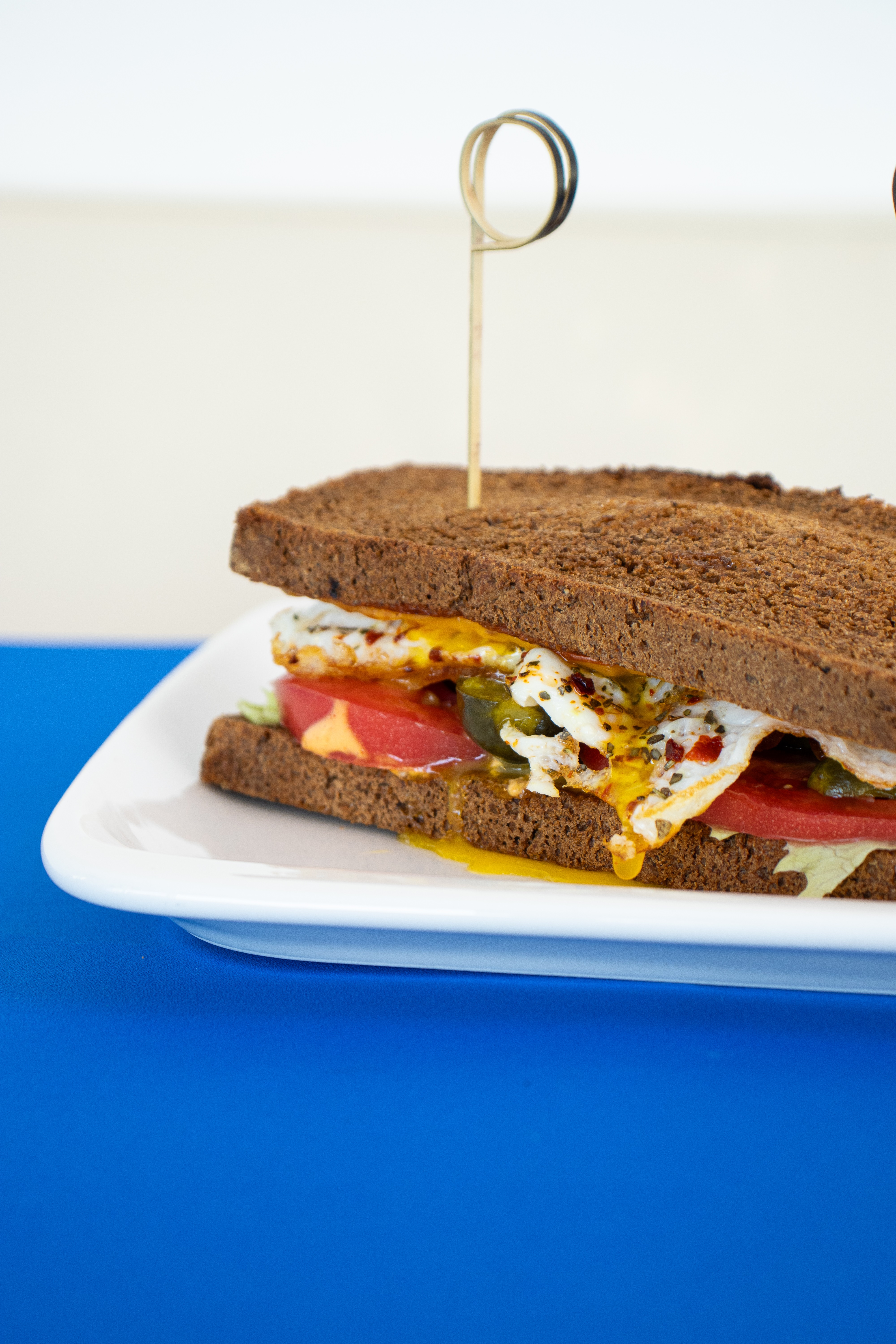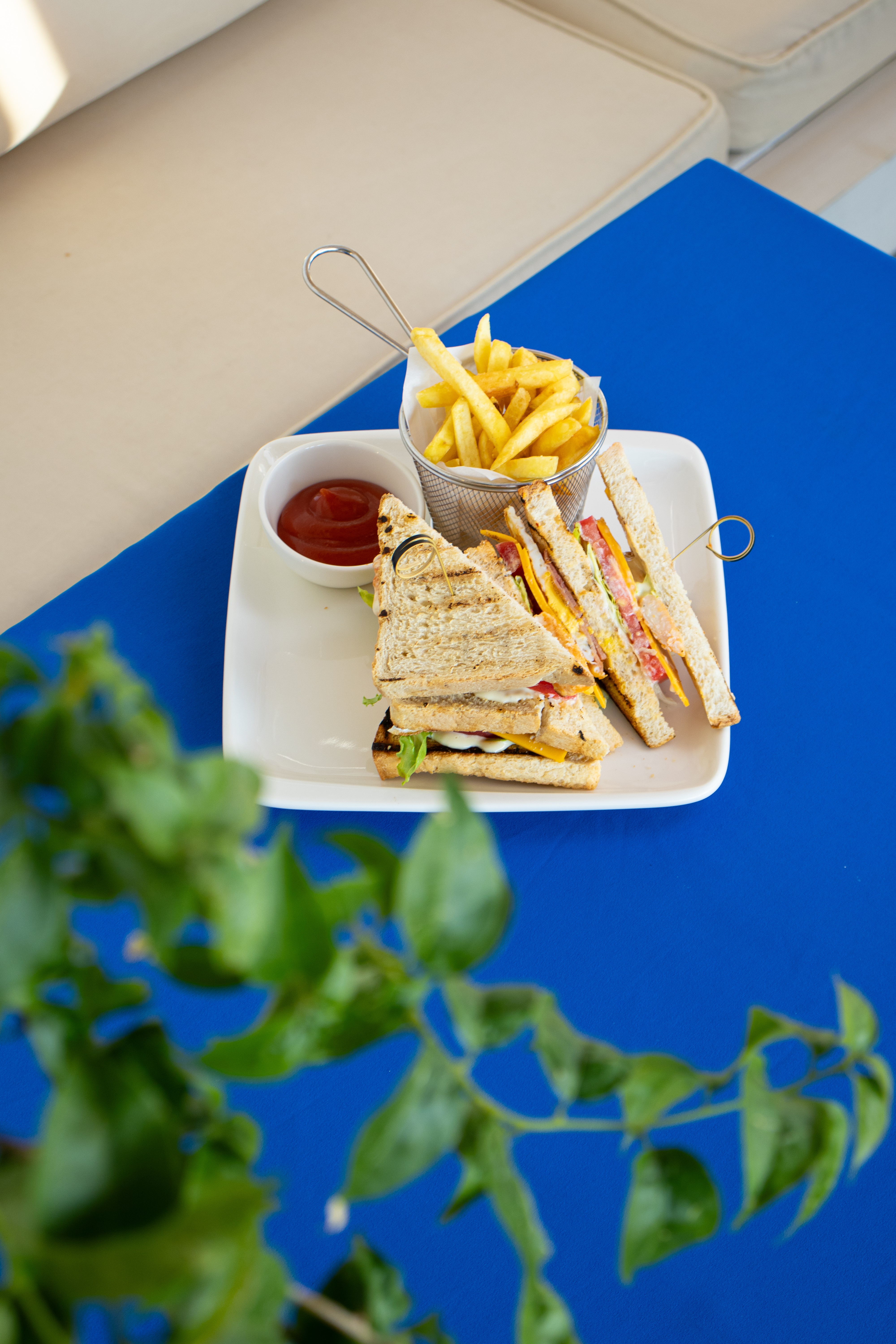 დაგრილული ქათმის და ლორის ქლაბ-სენდვიჩი ტაფამწვარი კვერცხით და კარტოფილი ფრით