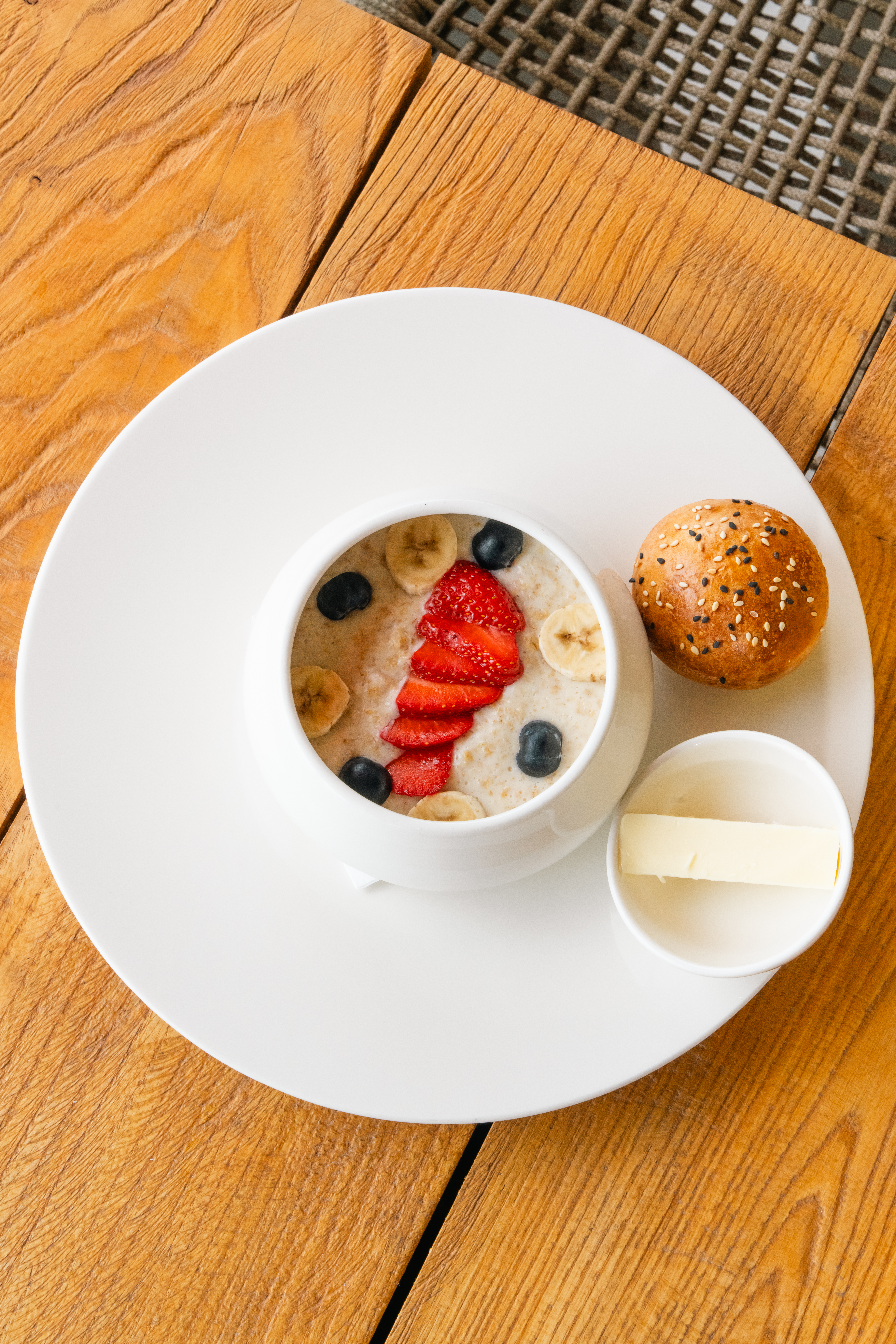 შვრიის ფაფის ფანტელი, რძე, კარაქი, ბანანი, მარწყვი, პური