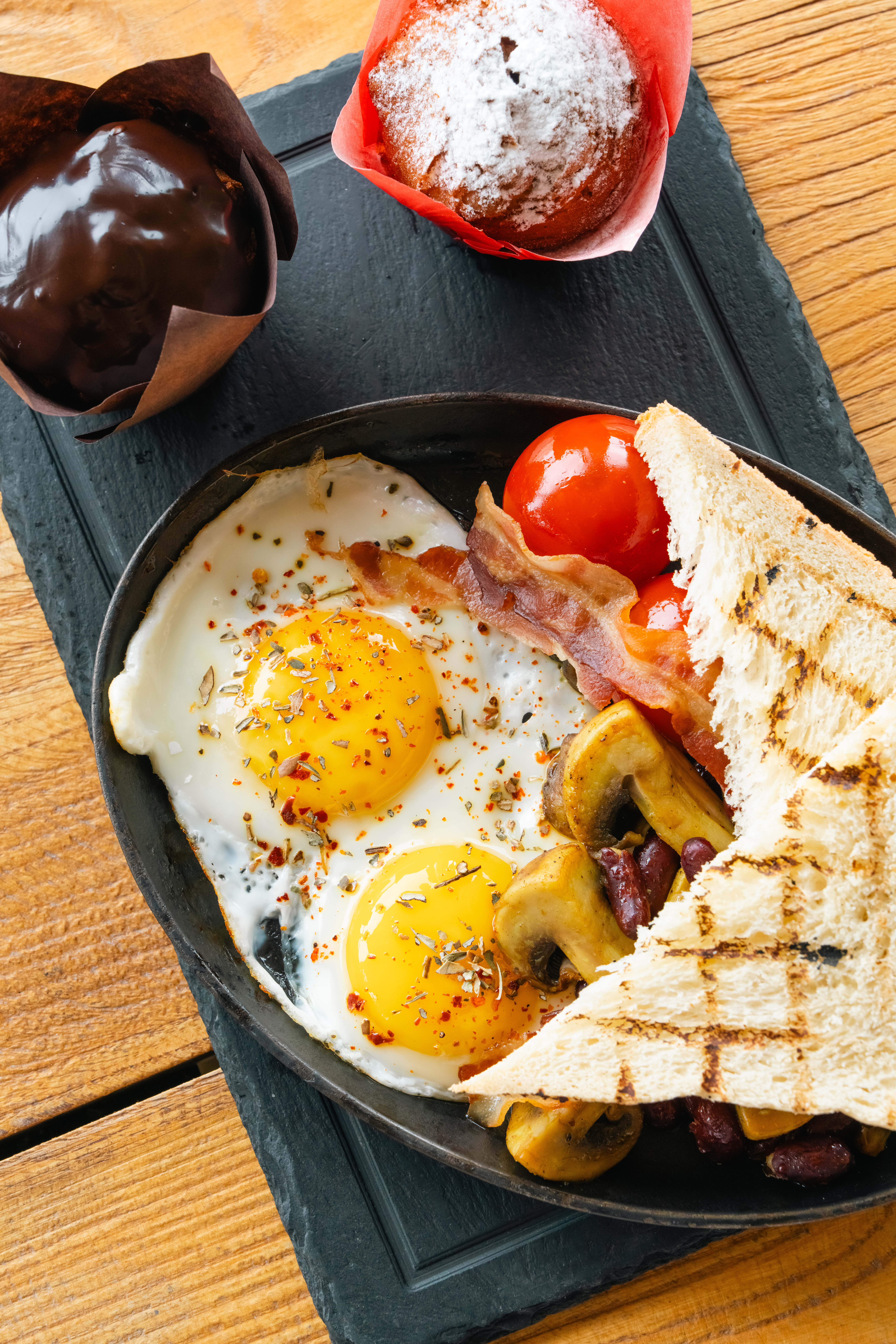 ტაფაკვერცხი, სოსისი, ბეკონი, პომიდორი, სოკო, ლობიო, ტოსტი, სუნელი.