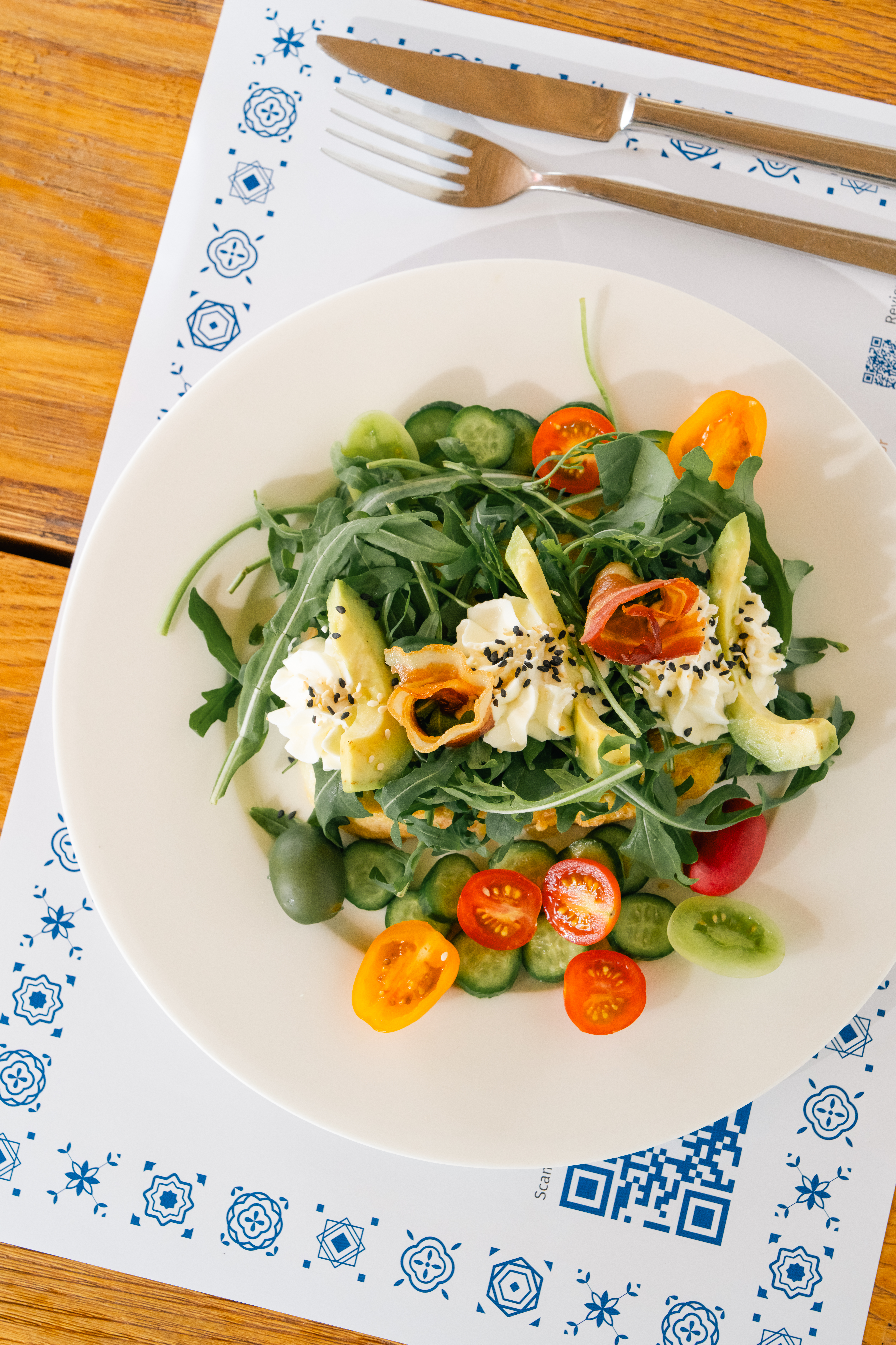 კვერცხი, კრევეტი, ჯინჯერი, ავოკადო,მწვანე ხახვი, სეზამი, ზეითუნი