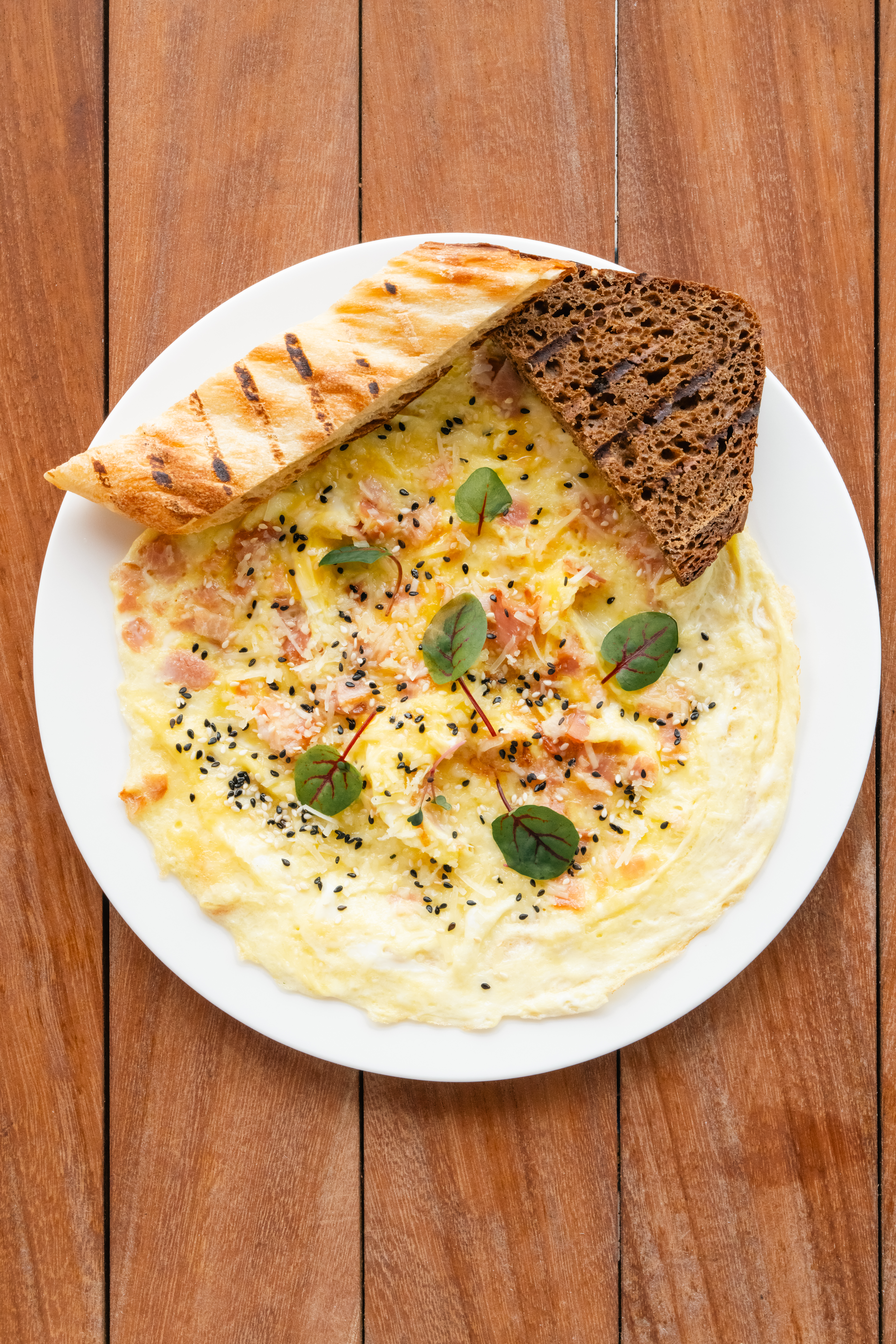 ომლეტი, ბეკონი, პარმეზანი, გახუხული შოთი