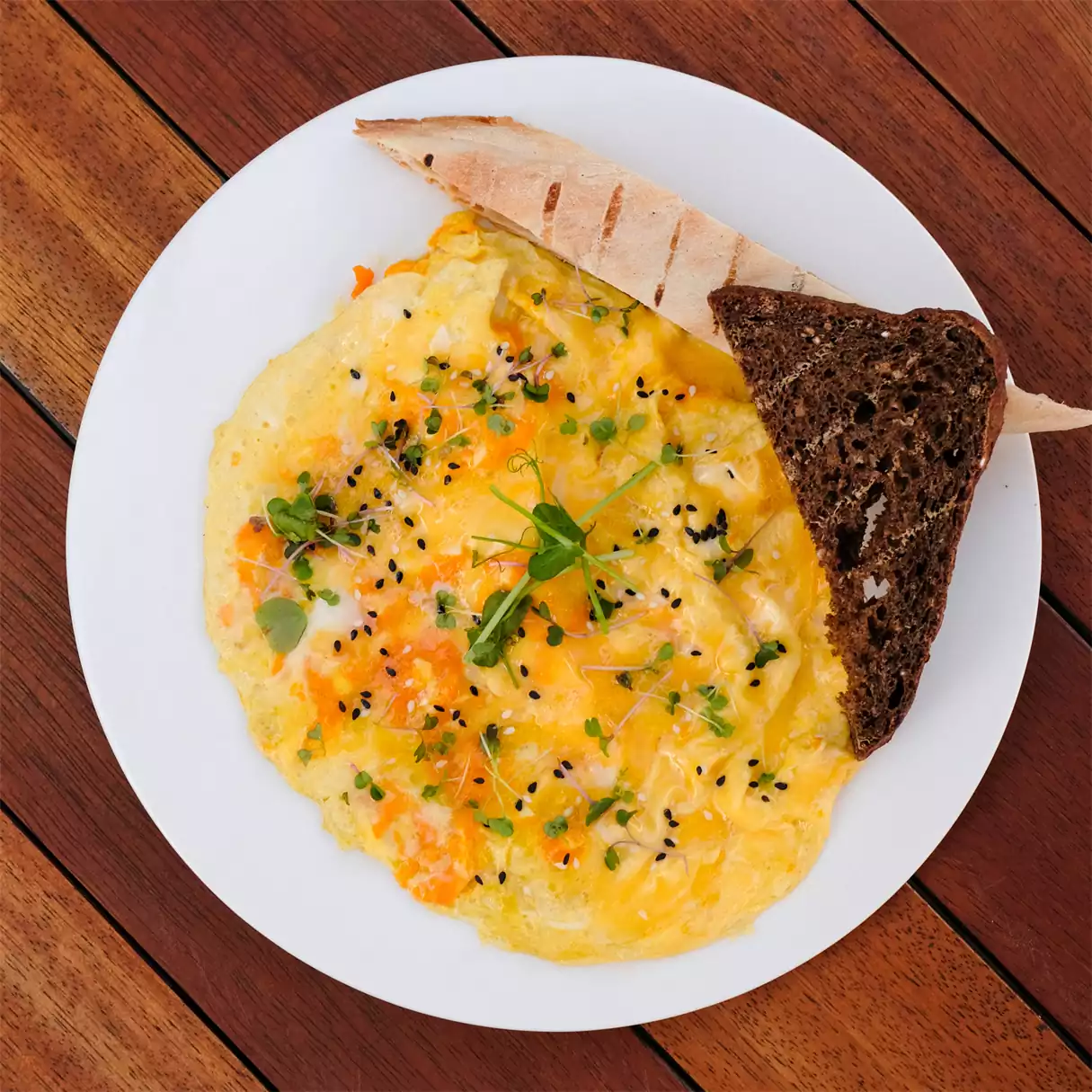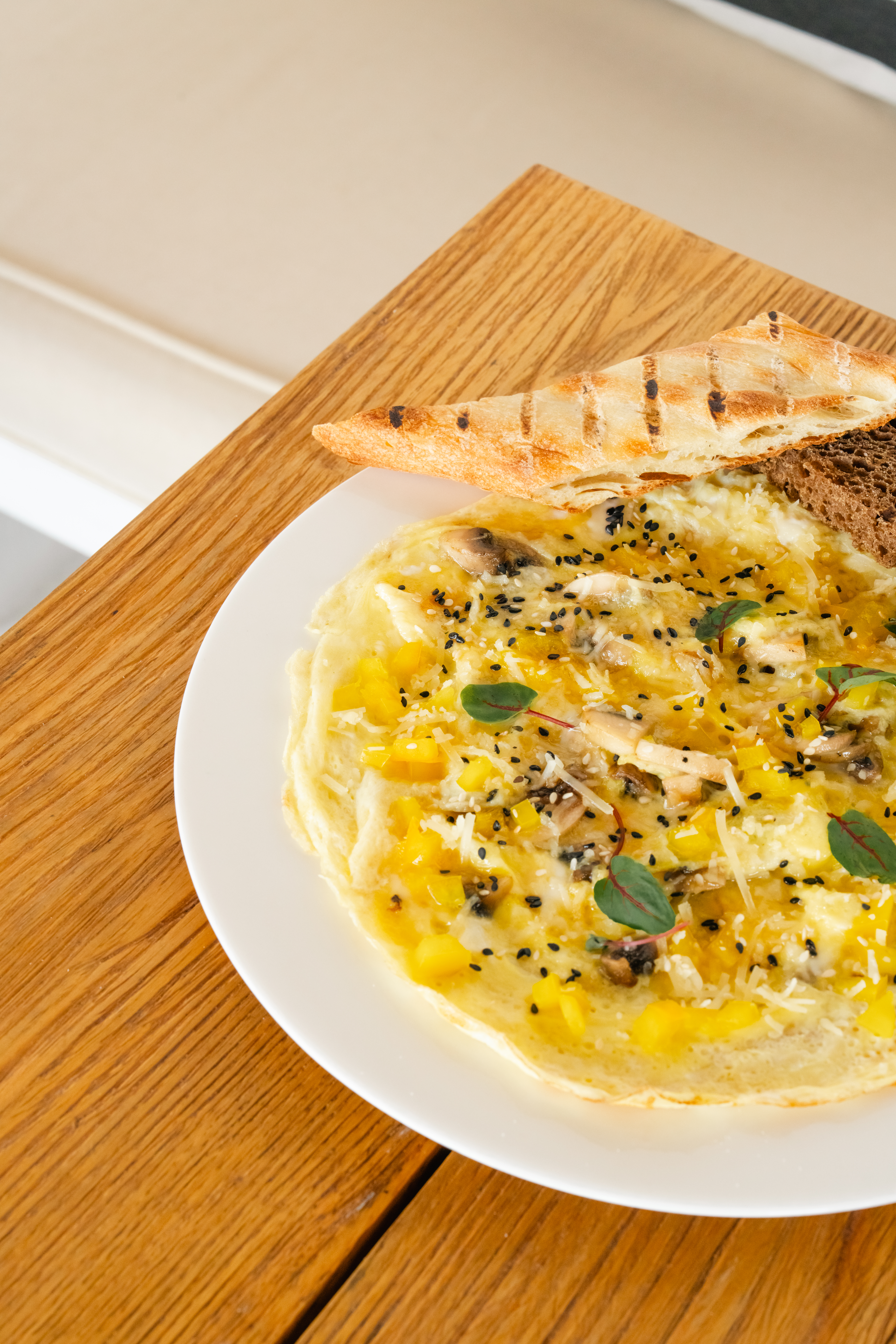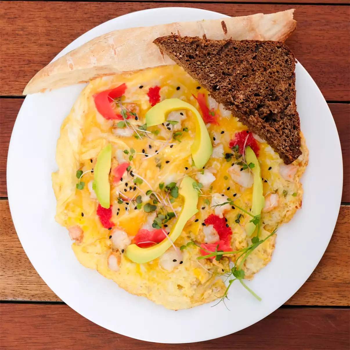 ომლეტი, სოკო, ბულგარული წიწაკა, პარმეზანი, ავოკადო, შოთი